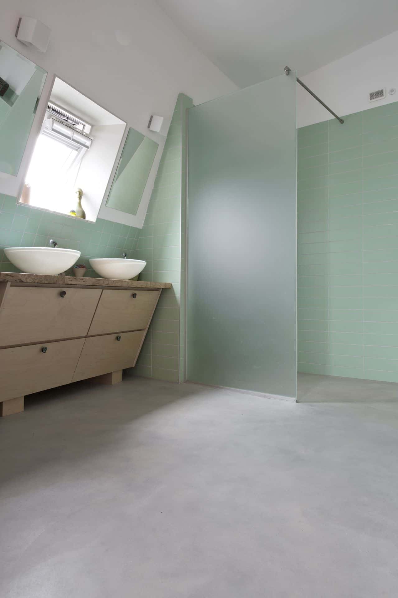 Op onderstaande foto’s zie je een traditionele en functionele badkamer met een mooie wandtegel. Wat minder traditioneel is, is de betonvloer. Hier ligt een gevlinderde woonbeton vloer. Het voordeel van de gevlinderde woonbeton vloer is dat deze vloer ook in het douchegedeelte kan. Hier laten we de betonvloer dan bewust wat ruwer tegen uitglijden en we brengen de betonvloer aan onder afschot naar het douchedrain.