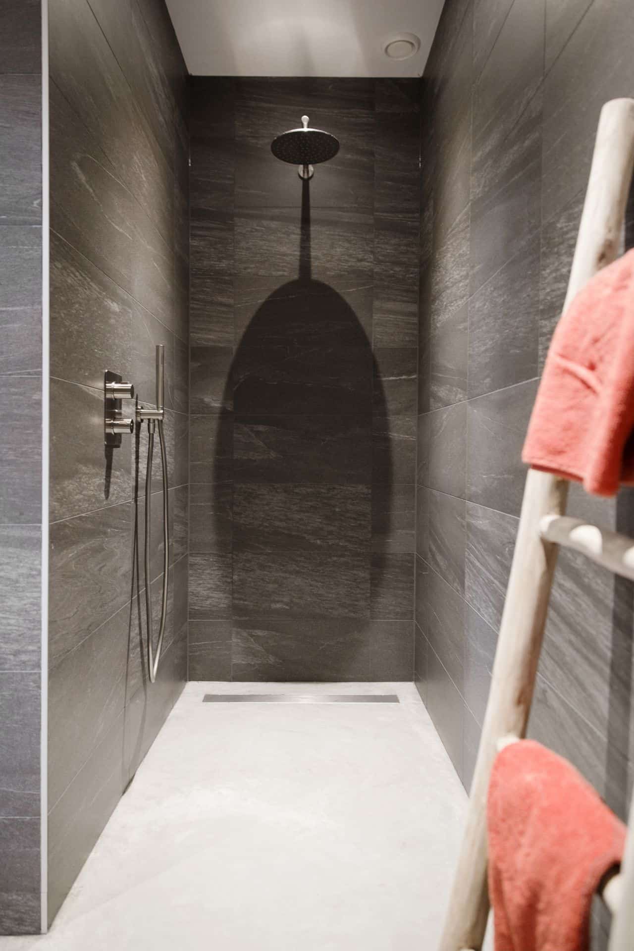 Beton ciré passen wij wel toe op de wanden in de badkamer, zelfs in het douchegedeelte, maar de vloer in het douchegedeelte maken wij niet in beton ciré. Een gevlinderde woonbeton vloer of PU gietvloer kan wel op de vloer in de badkamer.