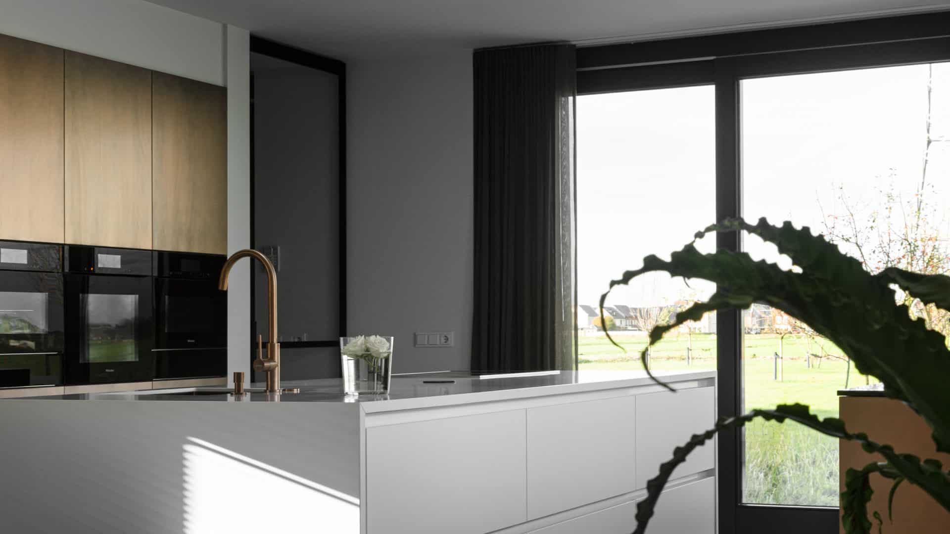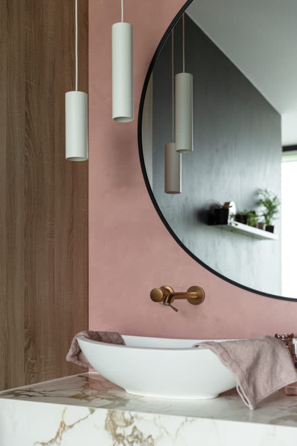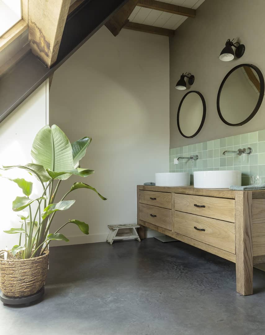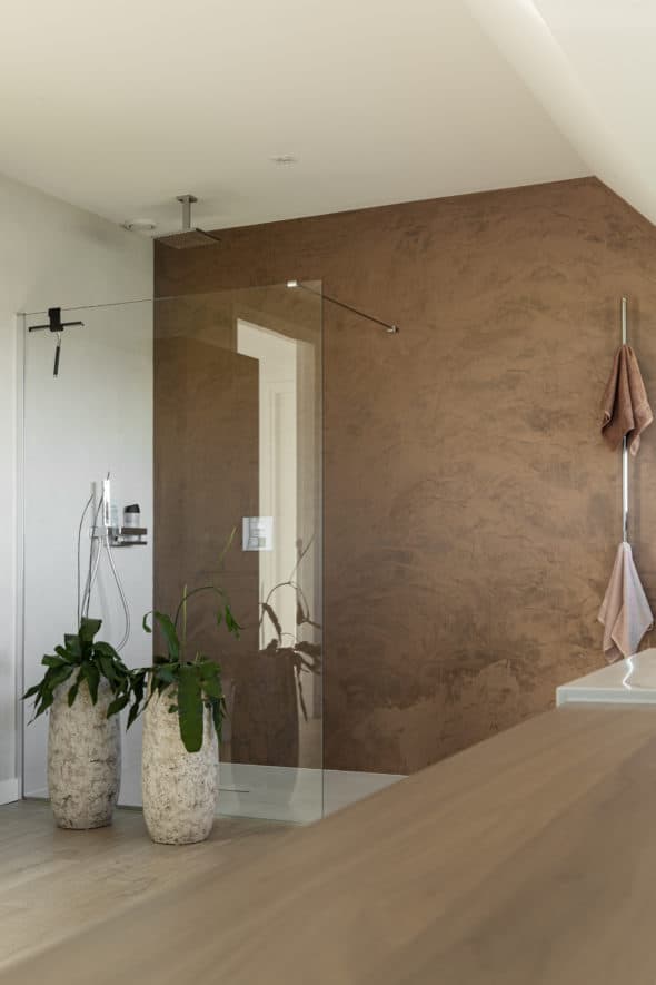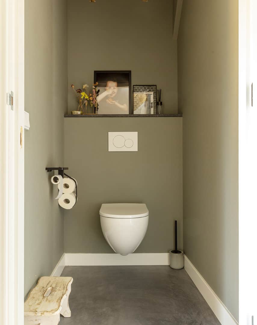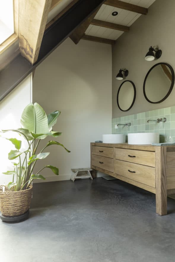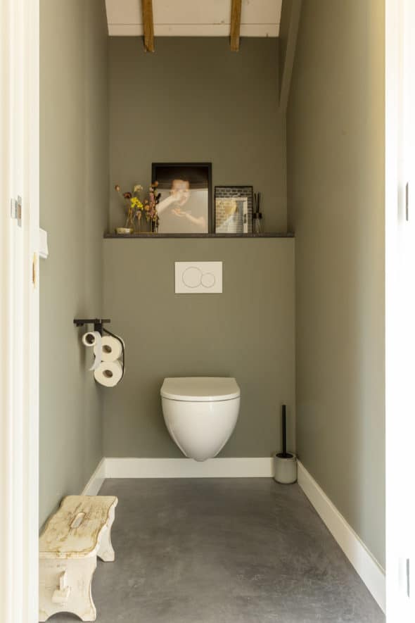 ‘Het is echt fijn. Op de wanden in de badkamer en de wc hebben we voor beton ciré van Willem Designvloeren gekozen in een meer olijfgroene kleur. We hebben nu nergens tegels meer en dus ook geen voegen. Dat scheelt veel bij het schoonmaken. Het is wel belangrijk om alles met het juiste middel schoon te maken. Ik gebruikte eerst groene zeep voor de beton ciré wanden, maar dat liet witte vlekken achter. Van Willem Designvloeren kreeg ik de tip iets ontvettends te gebruiken. En dat gaat perfect.’