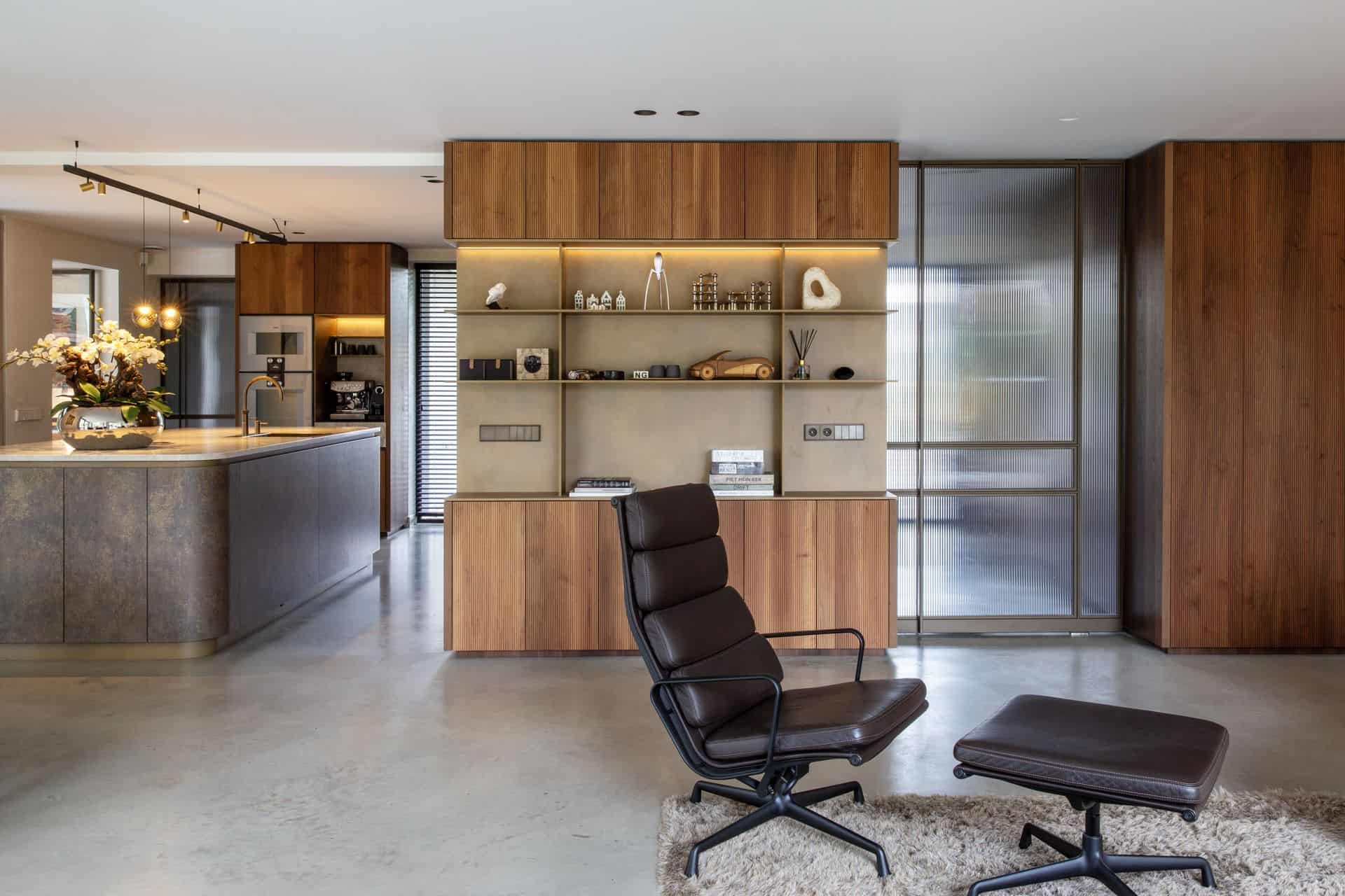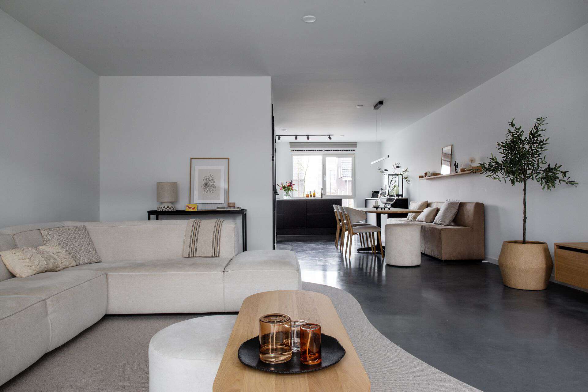 Woonkamer in Rijnsburg. Hierin ligt een gevlinderde betonvloer en dit is gecombineerd met veel houten en beige details.