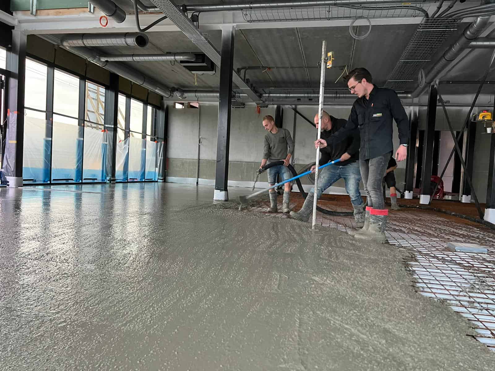 Een betonvloer is een vloer van minimaal 7 centimeter dik. In sommige gevallen is dit minimaal 9 of minimaal 12 centimeter. Heeft u de ruimte? Dan geven wij het advies om voor en 9 centimeter dikke betonvloer te kiezen. Het gaat hier om puur beton, dus een mengsel van cement, grind, zand en water en andere hulpstoffen. We storten dit met een betonpomp in uw woning en zodra het beloopbaar is, vlinderen we de vloer.