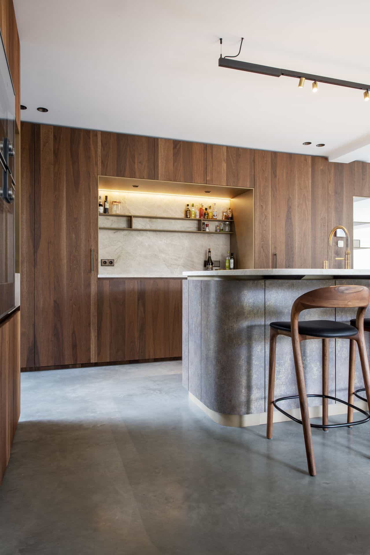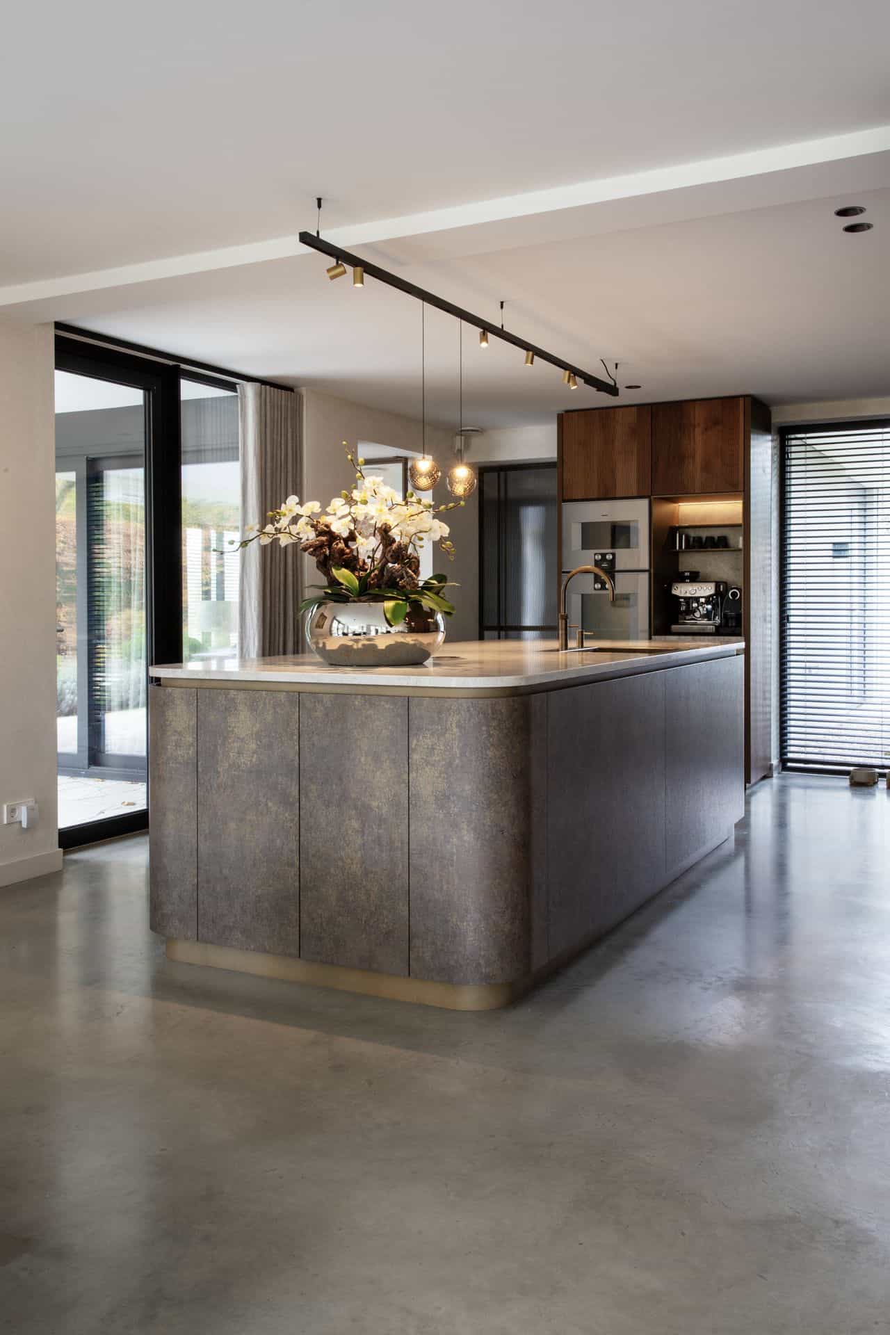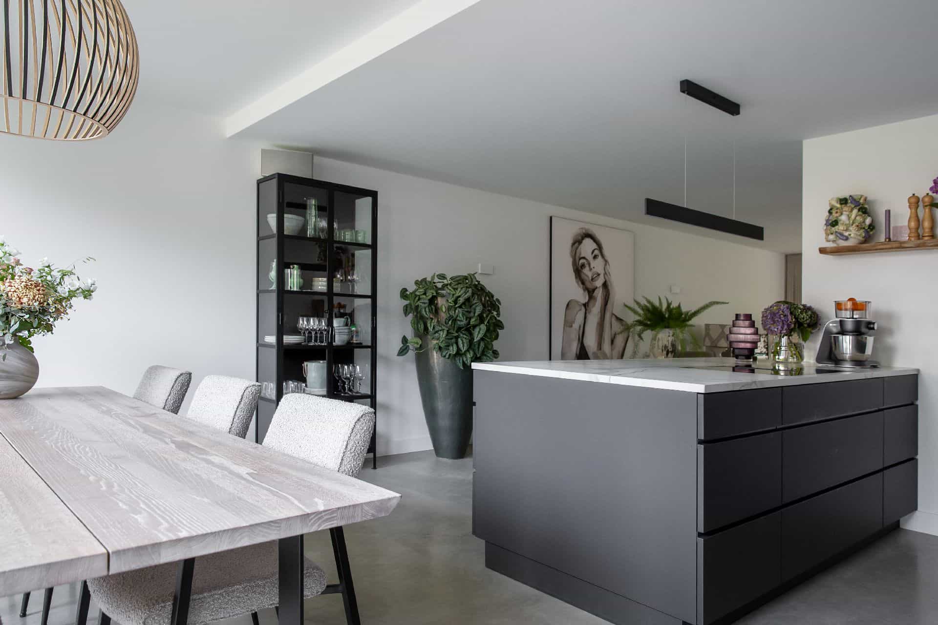 Tijdens deze grote renovatie kozen de bewoners uit Waalwijk voor een gevlinderde betonvloer in de kleur 75% basisgrijs en 25% zandkleur. In de woning is veel gebruik gemaakt van donker hout, wandkasten en de keuken. Leuk feitje: de keuken is gemaakt door een handige vriend!