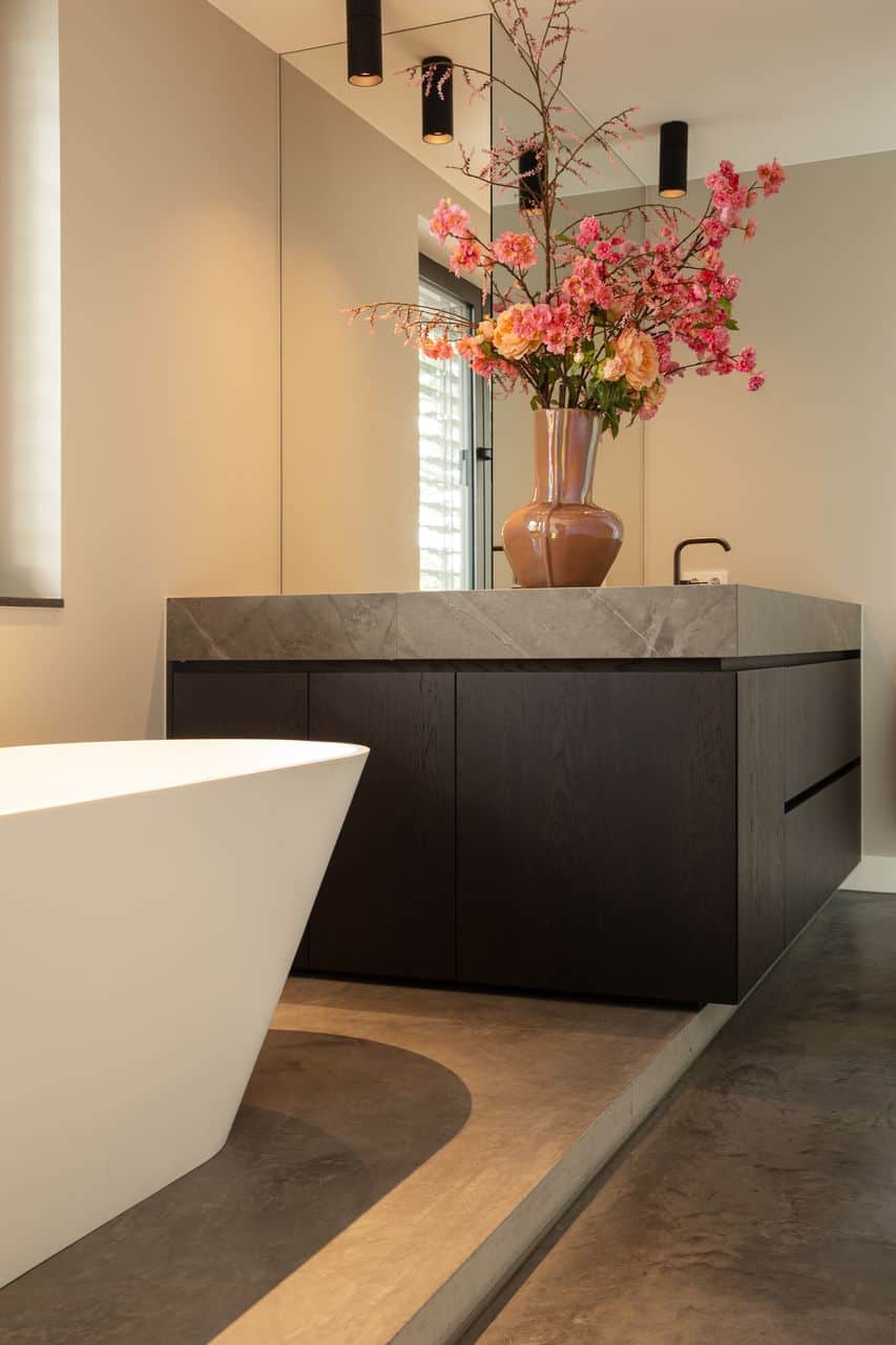 In de badkamer wil je dat spa-gevoel, toch? Marmerlook tegels zijn mooi, maar een gevlinderde betonvloer tilt de sfeer naar een hoger niveau. Denk aan een inloopdouche met zwarte of gouden kranen, zachte handdoeken opgerold in een nis en een geurkaars die zachtjes brandt. De hotel chique vloer geeft de ruimte die rustige, luxe basis waardoor je elke ochtend wakker wordt alsof je in een wellness resort logeert. Een gevlinderde betonvloer kan ook in het douchegedeelte zelf gerealiseerd worden. Door het ontbreken van naden is dit onderhoudsvriendelijker dan tegels!