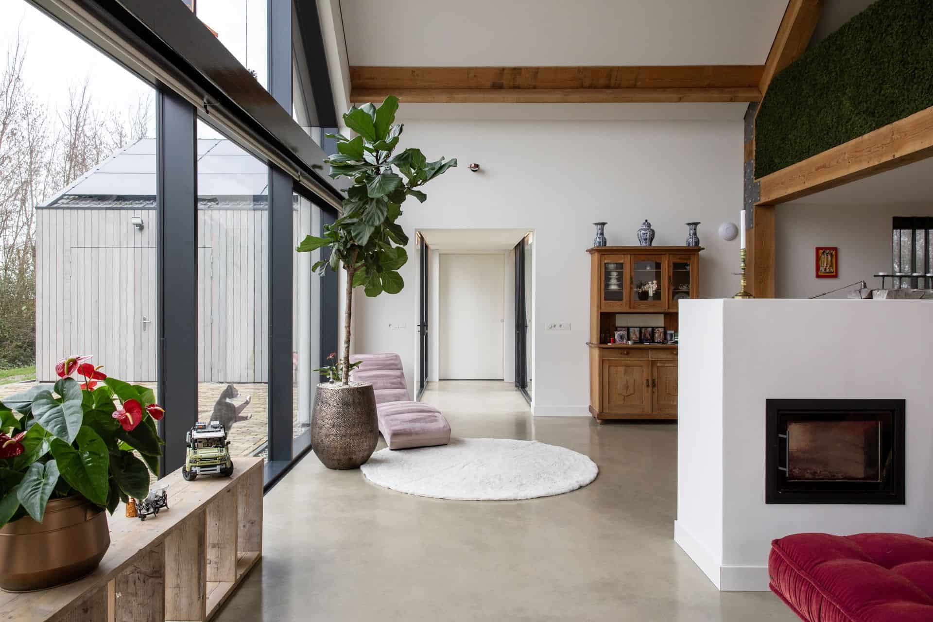 Michiel (50) en Christa (50) lieten hun boerderij uit 1921, in het Zeeuwse Lewedorp, verbouwen tot droomhuis. De boerderij kreeg een moderne aanbouw met strakke, houten latten aan de buitenzijde, en binnen kijk je tot aan de nok. Hier zijn karakteristieke, dikke houten balken gebruikt. Daarbij koos het stel voor een gevlinderde betonvloer op de begane grond in de kleur basisgrijs met 50% zandkleur.