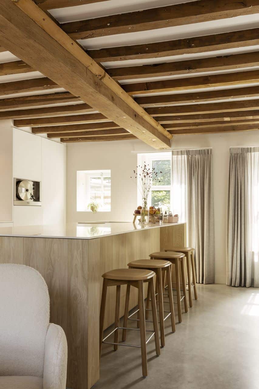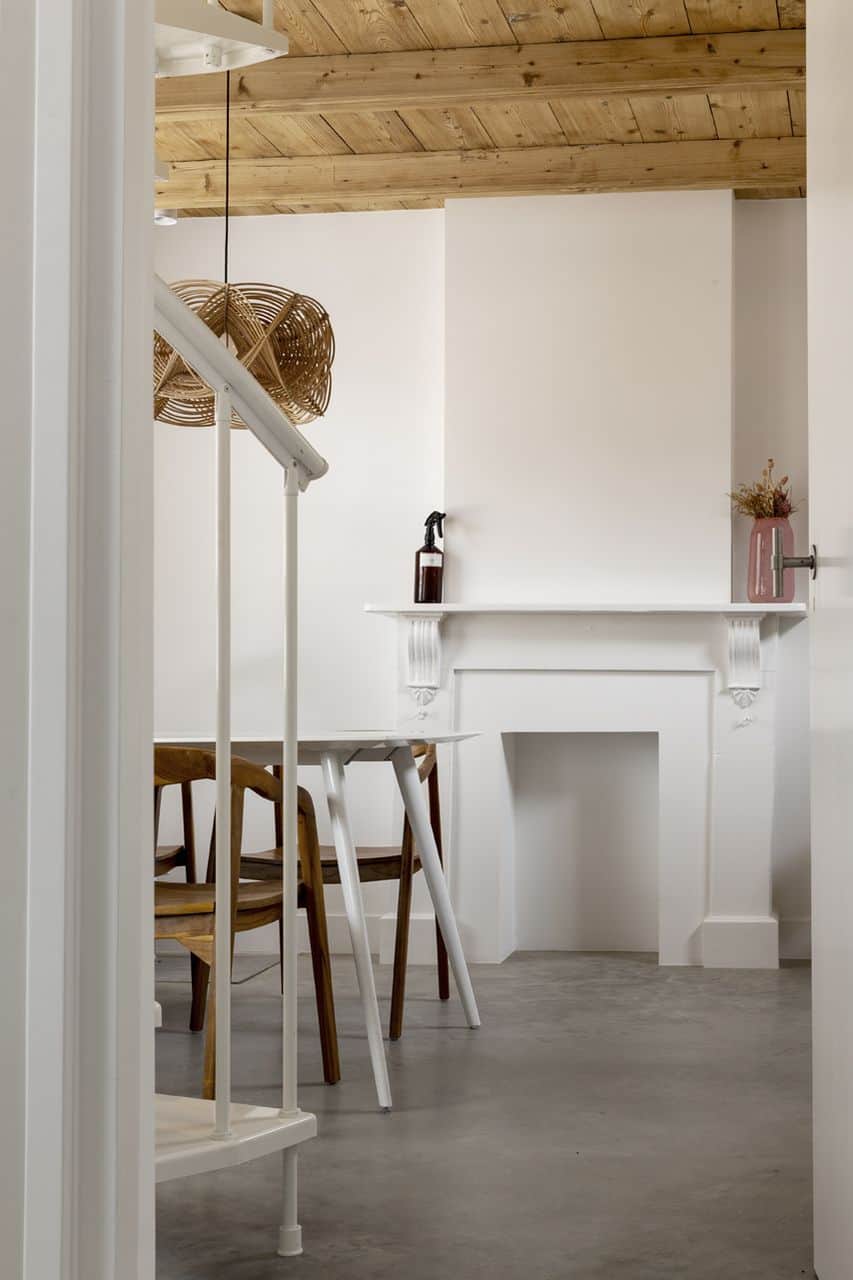 Een moderne, ruimtelijke inrichting thuis geeft het gezin rust. “Ik vind het strakke heel gaaf in combinatie met de oude elementen van het huis. Het huis is vooral aan de buitenkant heel idyllisch. De witte keuken is modern en de meubels zijn meer richting Scandinavisch.”