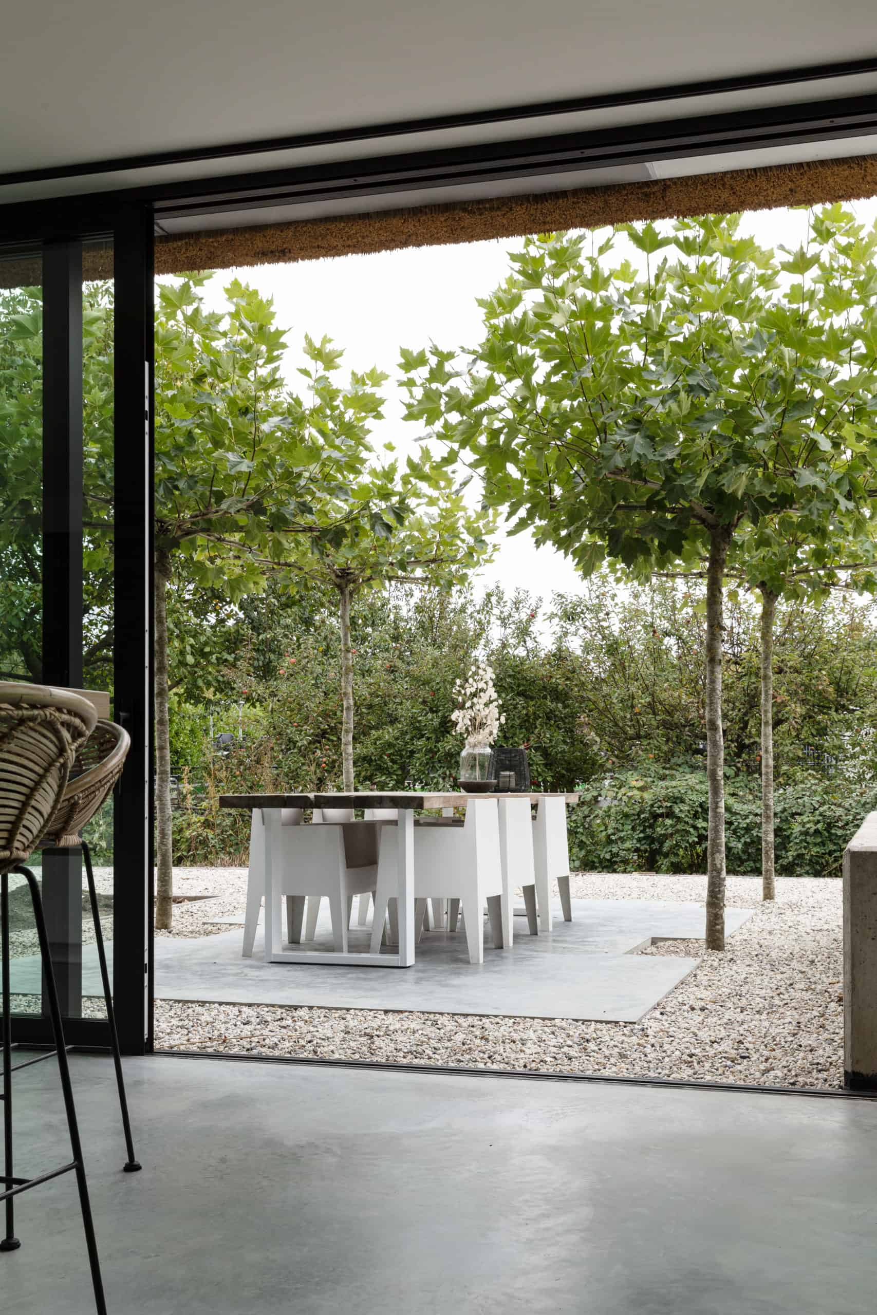 Laat de vloer naadloos doorlopen tot buiten onder bijvoorbeeld een veranda. zo ontstaat er een optische verbinding tussen binnen en buiten. Zo kan je een betonnen terras laten doorlopen vanuit je woonkamer. - Materialenmix